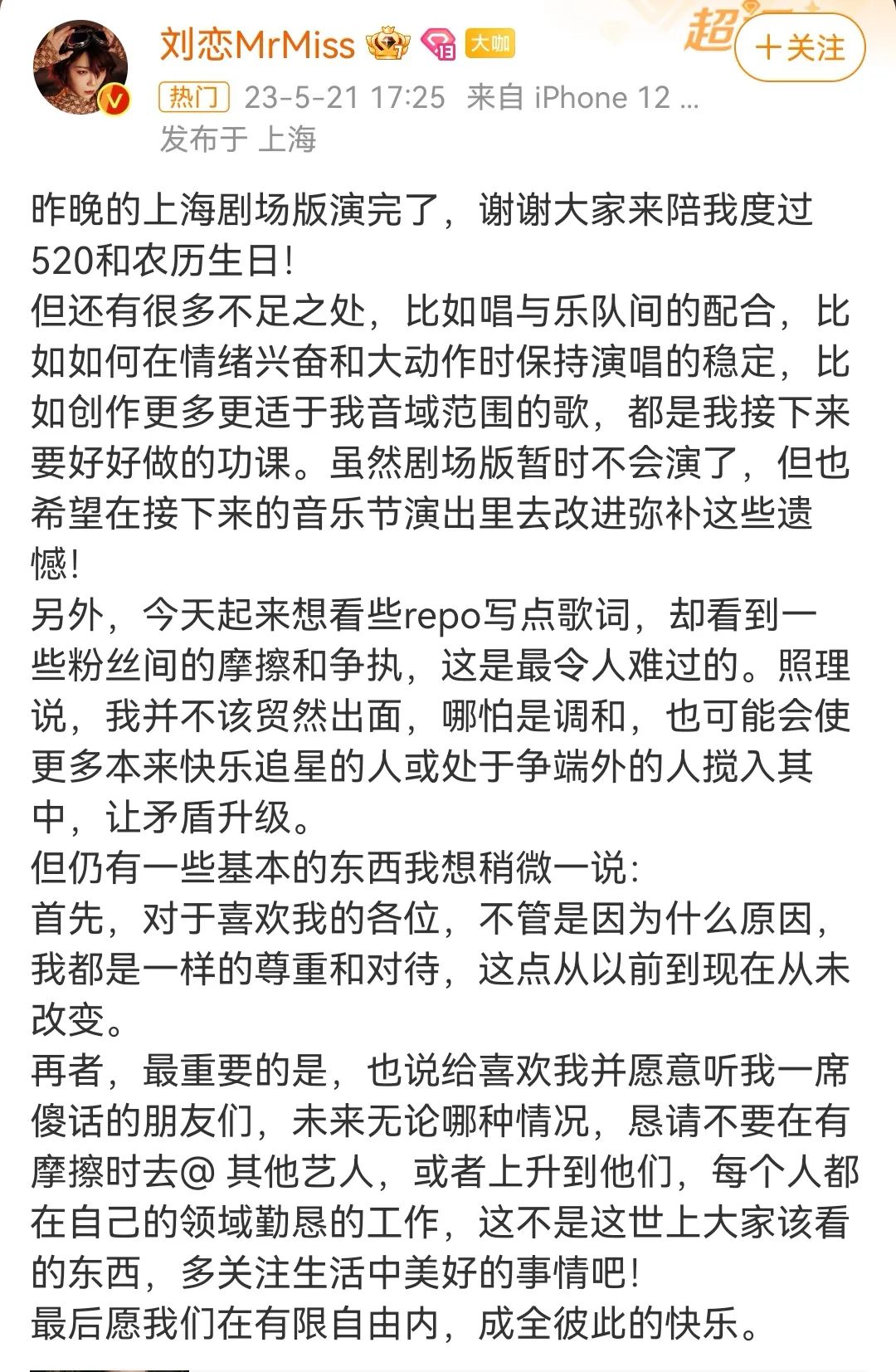 5月21日,Mr.Mss樂隊主唱劉戀發(fā)文稱“看到一些粉絲間的摩擦和爭執(zhí),這是最令人難過的”,“哪怕是調(diào)和,也可能會使更多本來快樂追星的人或處于爭端外的人攪入其中,讓矛盾升級”。