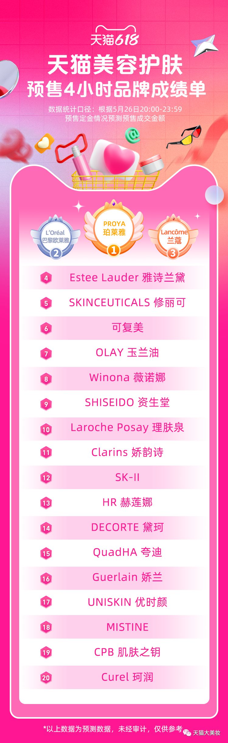 5月27日,天貓大美妝公布了5月26日8:00-23:59四個(gè)小時(shí)期間天貓美容護(hù)膚的品牌預(yù)售成績(jī)單。