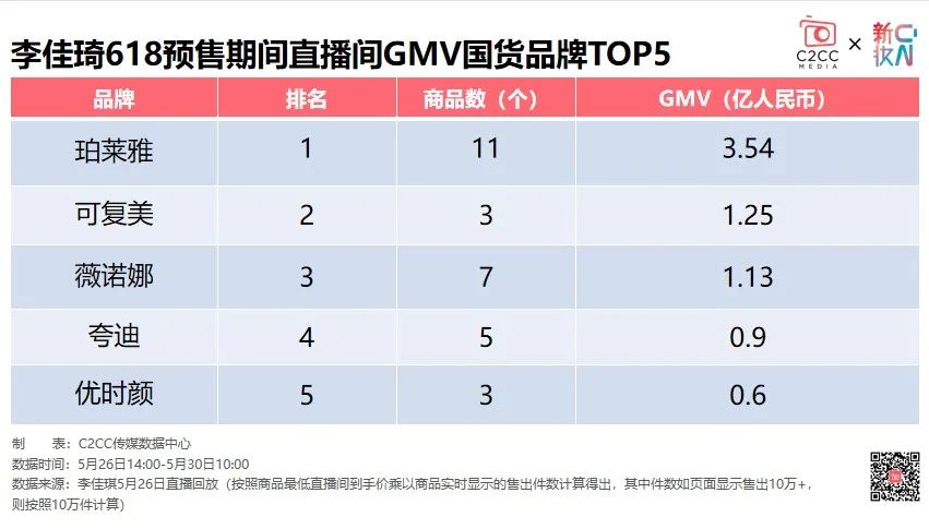 其中,GMV排名前二十的國(guó)產(chǎn)品牌,珀萊雅、可復(fù)美、薇諾娜、夸迪、優(yōu)時(shí)顏品牌在李佳琦直播間售賣GMV分別為3.54億、1.25億、1.13億、0.9億、0.6億總GMV達(dá)7.42億元,約占李佳琦直播間618預(yù)售首日總GMV的14.9%。