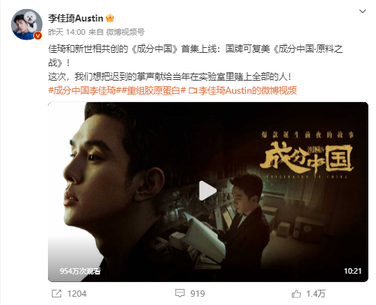 兩年后,李佳琦再度聯(lián)合新世相在618前夕打造了一款新紀(jì)錄片《成分中國(guó)·原料之戰(zhàn)》,揭秘可復(fù)美品牌研究重組膠原蛋白背后的故事,與《爆款中國(guó)》 有著異曲同工之妙。