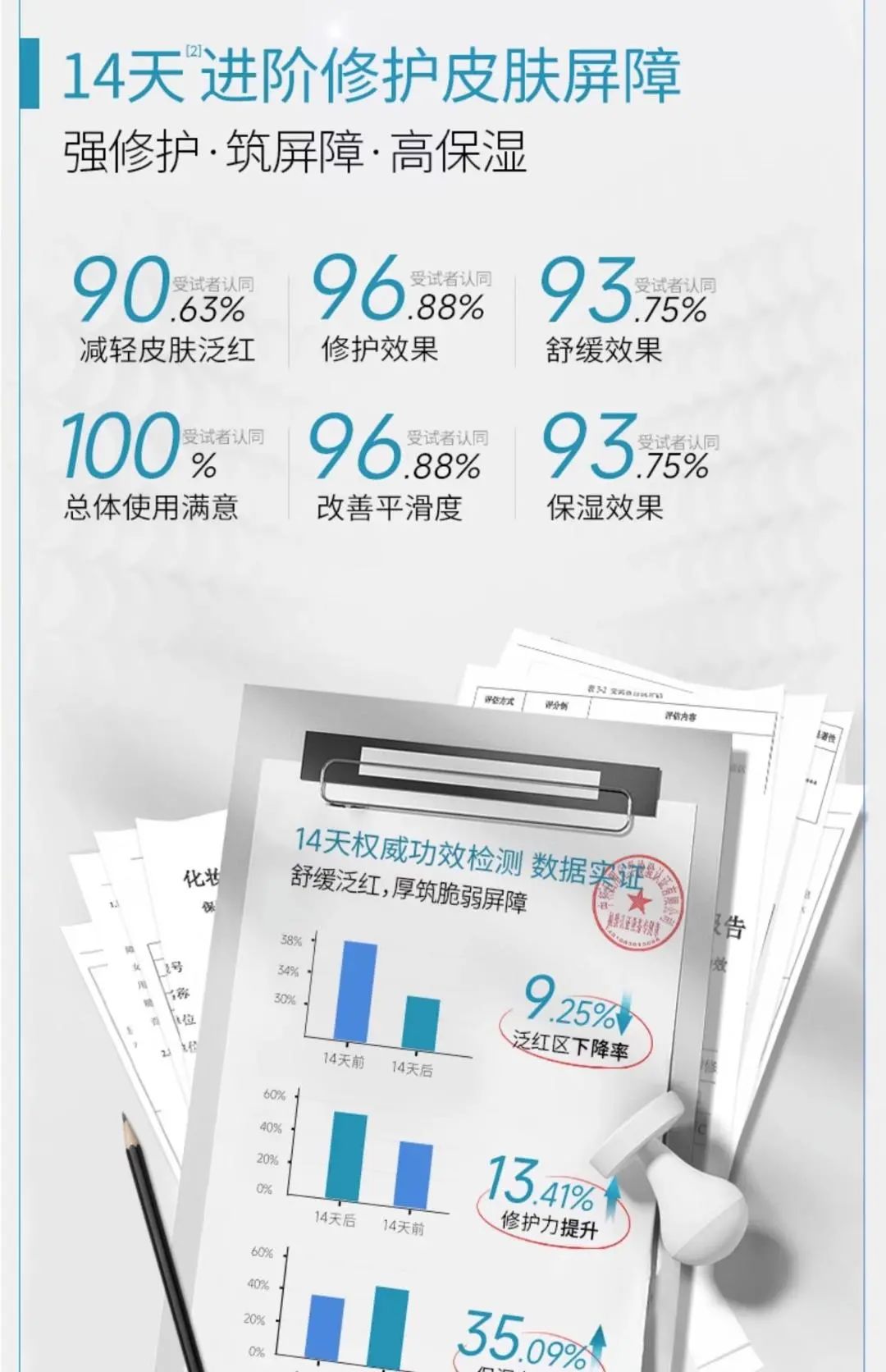 根據(jù)可復(fù)美提交的第三方功效檢測(cè)機(jī)構(gòu)測(cè)試數(shù)據(jù)顯示,機(jī)構(gòu)針對(duì)性選擇面部皮膚粗糙,且有明顯可見毛孔;面部皮膚伴有一定泛紅癥狀;皮膚屏障功能較差;自認(rèn)為敏感肌的中國(guó)健康男性/女性受試者33名,年齡范圍為18~35歲,連續(xù)使用可復(fù)美Human-like重組膠原蛋白肌御修護(hù)次拋精華2周(14天),通過統(tǒng)計(jì)學(xué)檢驗(yàn)方法進(jìn)行比較。