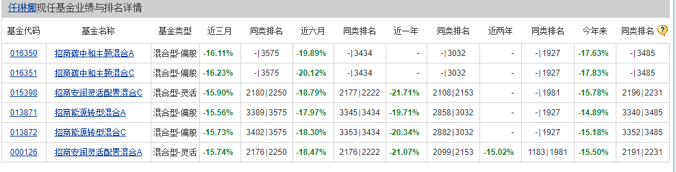 比如,基金經(jīng)理任琳娜,累計任職時間超4年,任職期間最佳回報是在上一家基金公司獲得。來招商基金后,其在管產(chǎn)品15.48億,現(xiàn)任產(chǎn)品業(yè)績,兩年內(nèi)全部為負(fù),有3只產(chǎn)品近1年跌幅超20%。