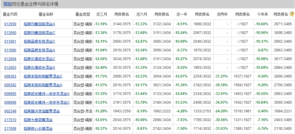 天天基金網(wǎng)顯示,郭銳現(xiàn)任的13只基金,今年以來無一能實現(xiàn)盈利,且排名均在同行后列。
