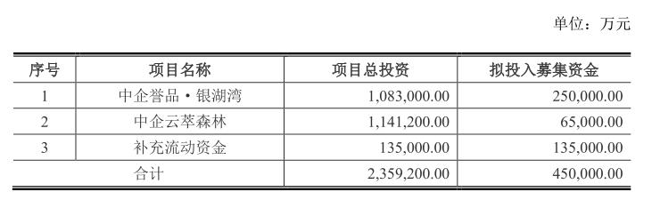 從募集資金用于的具體項目來看,上述45億資金中,中企譽品·銀湖灣項目,總投資108.3億元,擬投入募集資金25億元;中企云萃森林項目,總投資114.12億元,擬投入募集資金6.5億元;補充流動資金13.5億元,擬投入募集資金13.5億元。