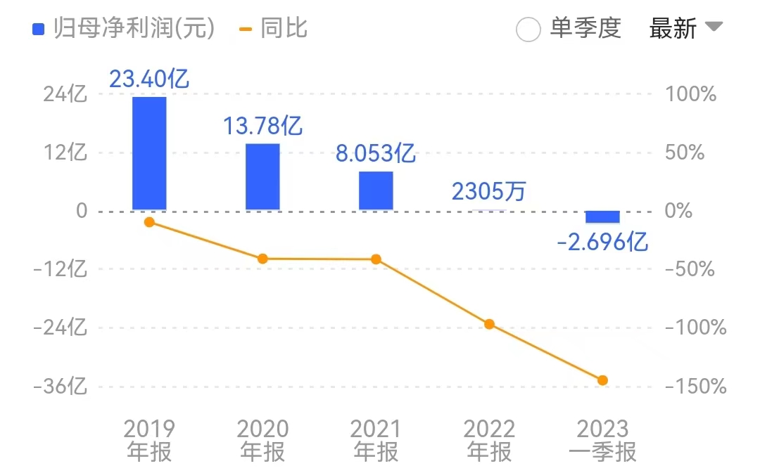 2019-2022年期間,公司營收分別為132.82億元、115.52億元、95.97億元、26.01億元,同比減少分別為31.13%、13.02%、16.92%、72.89%;對應凈利潤分別為23.40億元、13.78億元、8.05億元、2305萬元,依次同比下滑9.73%、41.11%、41.57%、97.14%。