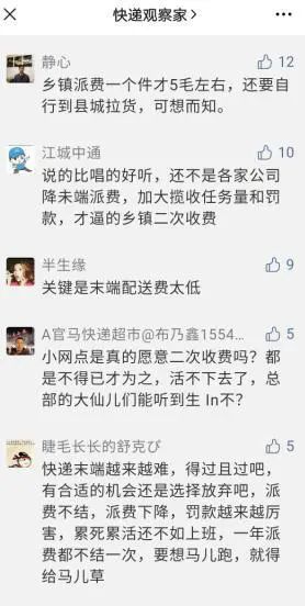 但各部門多次強(qiáng)調(diào),禁止取件二次收費(fèi)。派費(fèi)不斷下降的情況下,鄉(xiāng)鎮(zhèn)快遞到手的派費(fèi)僅剩三五毛錢,能否維持生存仍是一個(gè)問號(hào)。