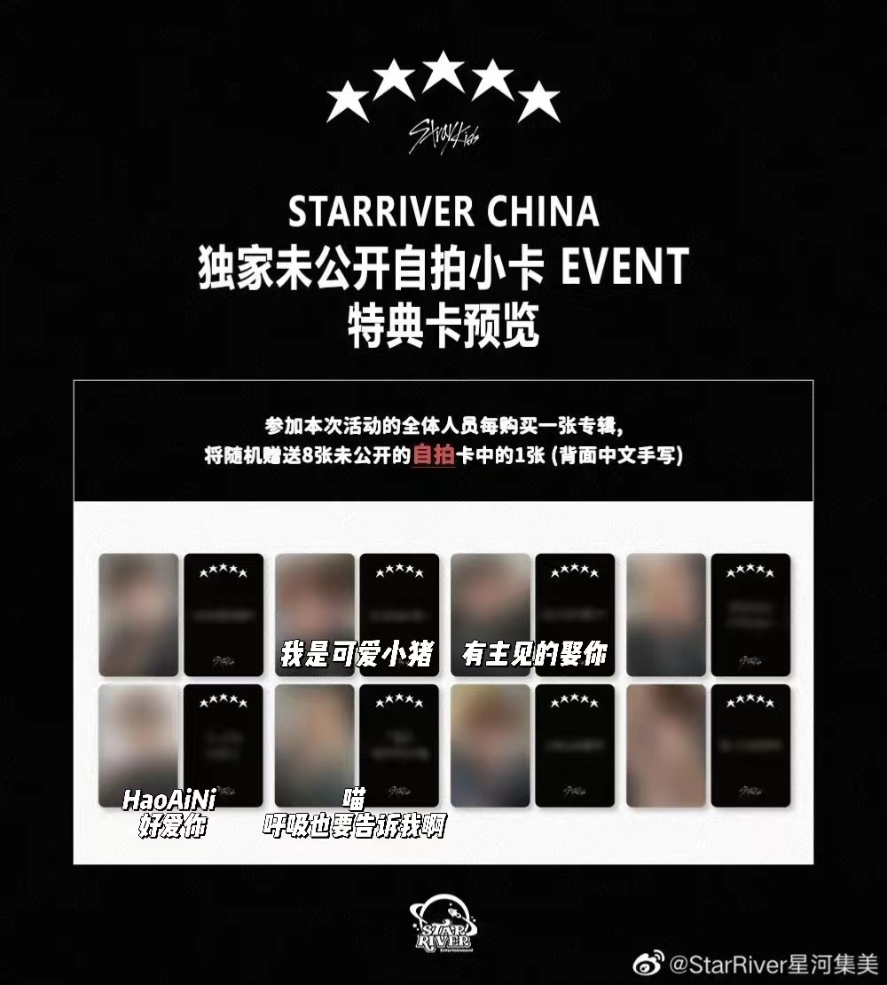 特典卡則是指平臺和偶像公司聯(lián)合推出的平臺限定。譬如近期正在專輯預(yù)售期的Stray Kids,目前已公布的平臺特典卡超過20種,于近期回歸的宋雨琦所在組合G-idle,和購物平臺KMStation合作的特典卡,已經(jīng)出了三個版本。