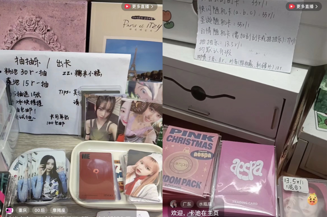 這些直播間內(nèi),往往都有著手寫的小看板,寫著“15/20/30一抽”“池子含XX團(tuán)”“貴婦包裝”等關(guān)鍵信息,在小紅書直播頁還會有“00后攤主”“溫柔大姐姐”的個性標(biāo)簽。有的時候,直播間只因?yàn)橹鞑奶?、唱歌好聽就會爆滿。