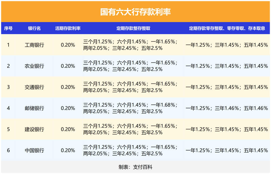 同天發(fā)布公告的工行、中行、建行、交行、郵儲(chǔ)銀行對(duì)人民幣存款利率也進(jìn)行了調(diào)整,活期存款利率統(tǒng)一下調(diào)至0.2%,長(zhǎng)期存款利率全部降至2.5%以下(含2.5%),六大行中整存整取利率已基本統(tǒng)一。