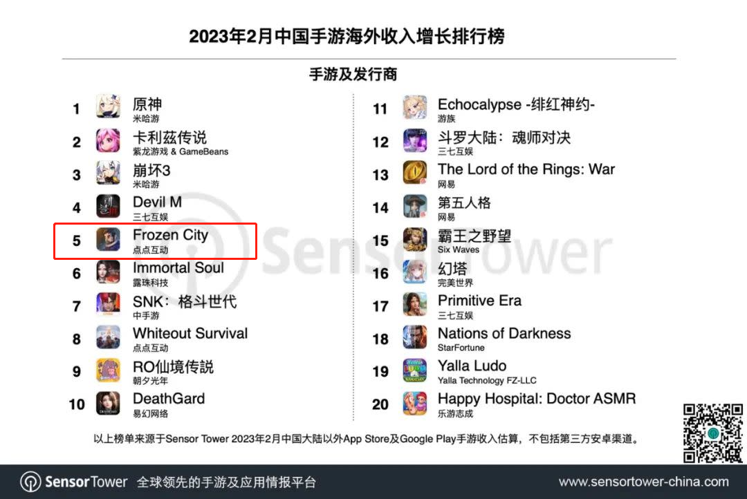 相較于國內(nèi)市場的“摸索”,去年有點點互動憑借IP衍生游戲《Family Farm Adventure》(菲菲大冒險)在北美市場獲得亮眼成績,今年又有《Frozen City》(冰封時代)闖進(jìn)2月海外收入增長榜前5。