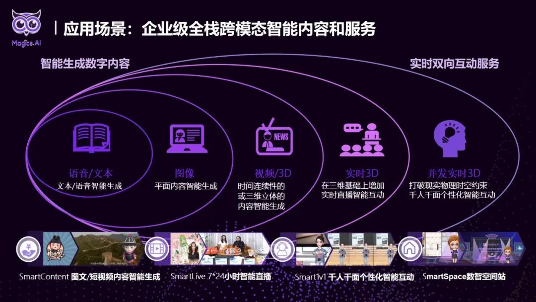邁吉客科技給自己的一個標(biāo)簽是“跨模態(tài)”,該公司專注于智能數(shù)字資產(chǎn)和智能生成領(lǐng)域,主要產(chǎn)品是智能內(nèi)容生產(chǎn)、智能虛擬直播、千人千面的個性化智能互動,以及最近在中關(guān)村論壇上發(fā)布的新品-數(shù)智空間站,三維、實時、智能是其亮點優(yōu)勢。