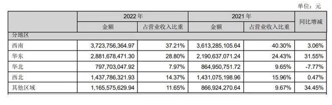 從銷售區(qū)域來看,西南地區(qū)仍為新乳業(yè)的第一大銷售區(qū)域,2022年該地區(qū)銷售額實現(xiàn)37.24億元,為新乳業(yè)貢獻(xiàn)了近四成營收,但相較于2021年40.30%的營收占比減少了3.09%。