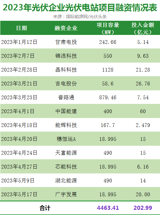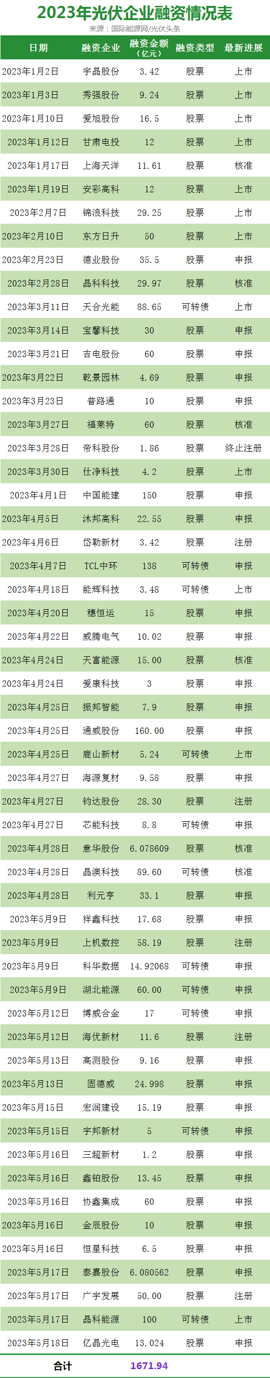 從融資進(jìn)度來(lái)看,截止5月底,有12家企業(yè)已經(jīng)完成了融資。其中包括天合光能、晶科能源、錦浪科技、愛(ài)旭股份等頭部企業(yè);5家企業(yè)進(jìn)入了增發(fā)上市注冊(cè)階段,分別為上機(jī)數(shù)控、鈞達(dá)股份、海優(yōu)新材、廣宇發(fā)展、岱勒新材;6家企業(yè)融資計(jì)劃被證監(jiān)會(huì)核準(zhǔn)。他們是,意華股份、天富能源、上海天洋、晶科科技、晶澳科技、福萊特。有一家企業(yè)增發(fā)計(jì)劃被否決,該企業(yè)為帝科股份。其余包括通威股份、TCL中環(huán)、固德威等32家企業(yè)企業(yè)的增發(fā)計(jì)劃尚處于申報(bào)或者證監(jiān)會(huì)審核階段。