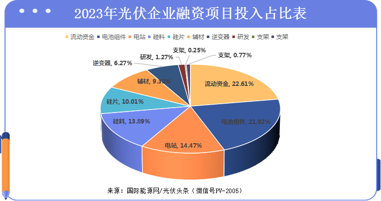 從上述項(xiàng)目投資金額以及占比情況來(lái)看,補(bǔ)充流動(dòng)資金仍排名第一。光伏行業(yè)作為高景氣度行業(yè),資金活躍程度高,企業(yè)需要大量流動(dòng)資金用于采購(gòu)原材料等經(jīng)營(yíng)生產(chǎn)活動(dòng)。除此之外電池組件環(huán)節(jié)、電站、硅料、硅片環(huán)節(jié)依然是資本較為青睞的環(huán)節(jié)。同時(shí)這些環(huán)節(jié)也是重資產(chǎn)投入環(huán)節(jié),需要大量資金投入。