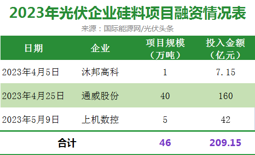 國(guó)際能源網(wǎng)/光伏頭條統(tǒng)計(jì),在A股市場(chǎng)上,通威股份、上機(jī)數(shù)控、沐邦高科募投項(xiàng)目包括了多晶硅項(xiàng)目。3家企業(yè)募投多晶硅項(xiàng)目合計(jì)46萬(wàn)噸,合計(jì)擬使用募集資金209.15億元。