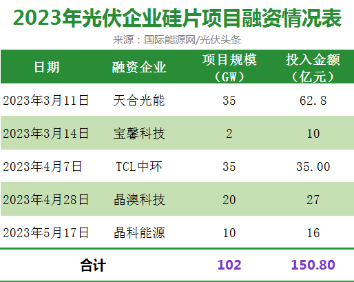 其中,通威股份募資160億元,全部擁用于年產(chǎn)20萬(wàn)噸高純晶硅項(xiàng)目以及云南通威水電硅材高純晶硅綠色能源項(xiàng)目(二期 20 萬(wàn)噸/年高純晶硅項(xiàng)目),這是1-5月最大的一筆募資項(xiàng)目。