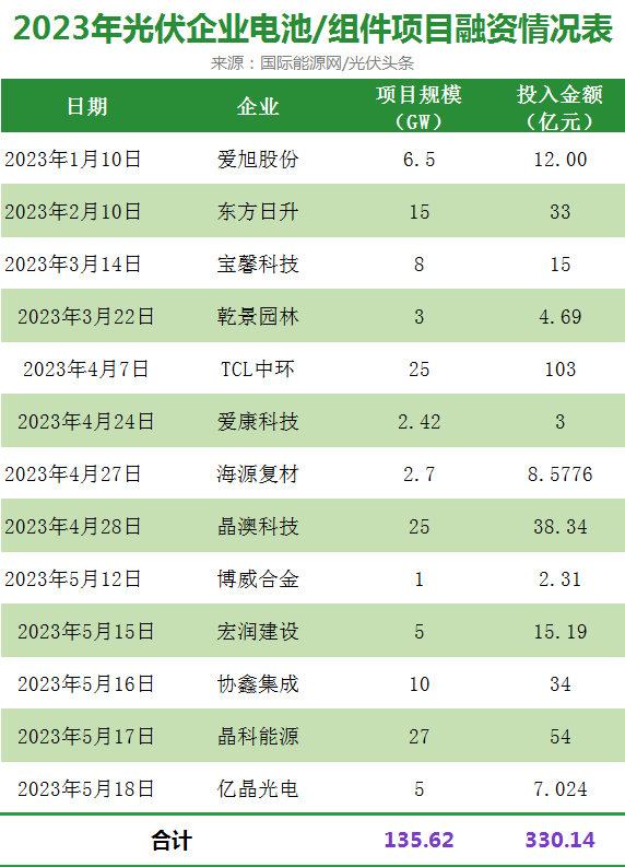 國(guó)際能源網(wǎng)/光伏頭條統(tǒng)計(jì),晶澳、晶科、愛(ài)旭、TCL中環(huán)等13家企業(yè),拋出了135.62GW,330.14億元的募投計(jì)劃。