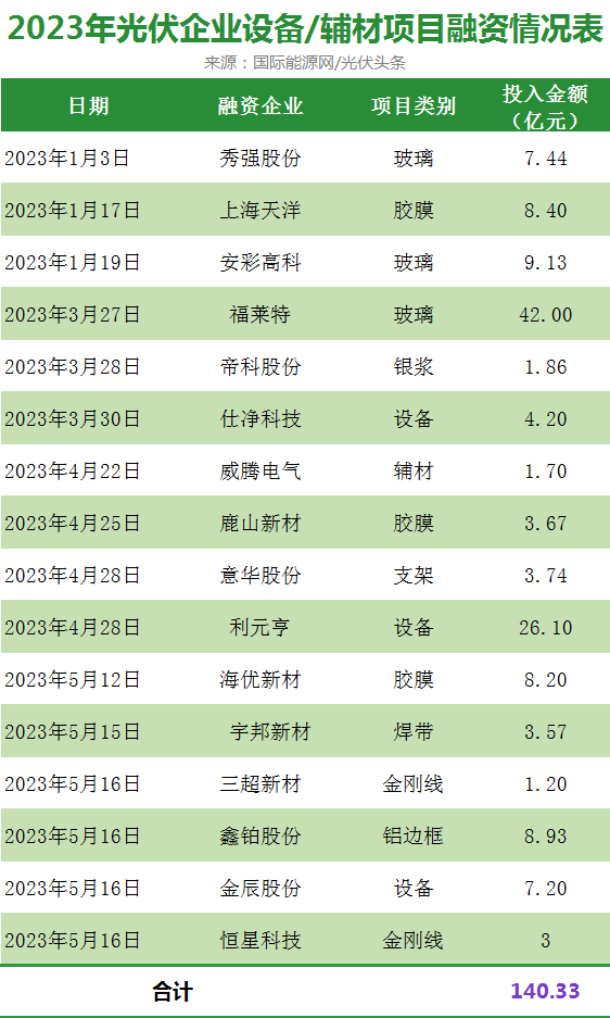 從去年以來(lái),光伏產(chǎn)業(yè)進(jìn)入了大規(guī)模的擴(kuò)產(chǎn)時(shí)期。而擴(kuò)產(chǎn)潮最大的收益者無(wú)疑是作為“賣(mài)鏟人”的光伏設(shè)備企業(yè)以及各個(gè)細(xì)分賽道的輔材企業(yè)。據(jù)國(guó)際能源網(wǎng)/光伏頭條統(tǒng)計(jì),安彩高科、福萊特、帝科股份、海優(yōu)新材、金辰股份等16家企業(yè)公布了與光伏設(shè)備、光伏輔材相關(guān)的募集計(jì)劃,合計(jì)擬募集資金140.33億元。