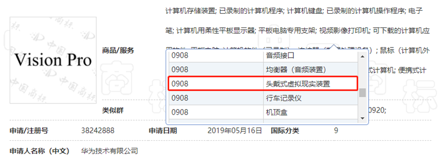 華為2019年申請注冊的“Vision Pro”商標核定使用商品類別包含頭戴式虛擬現(xiàn)實裝置等(來源:中國商標網(wǎng))