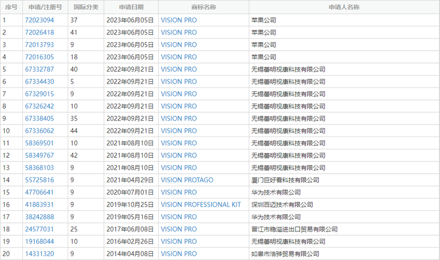 而且除了華為之外,目前申請注冊Vision Pro商標的人還不少: