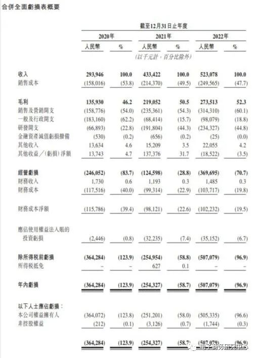 招股書顯示,2020-2022年,聚水潭實現(xiàn)收入分別約為 2.94 億元、4.33 億元以及 5.23 億元人民幣;年內(nèi)虧損分別約為3.64 億元,2.54 億元以及 5.07 億元,三年虧損11.25億元。