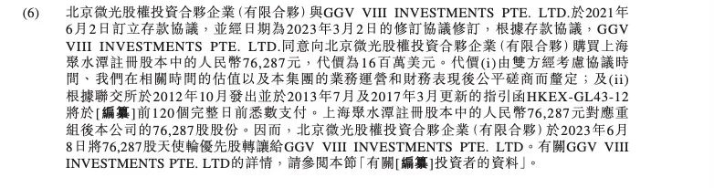 在招股書中,微光與GGV于2021年6月訂立存款協(xié)議,據(jù)該協(xié)議微光轉(zhuǎn)讓76287股天使輪優(yōu)先股給GGV,價(jià)格為1600萬美元,按金額跟份額計(jì)算,GGV每股購入價(jià)約為1514元/股;而微光天使輪優(yōu)先股購入價(jià)折算為35元/股,這意味著微光通過這些股份轉(zhuǎn)讓可獲得1.13億元的差價(jià)收益,交易于2023年6月8日進(jìn)行。轉(zhuǎn)讓后,IPO前GGV持股2%,微光持股2.96%。按照微光轉(zhuǎn)讓GGV的價(jià)格來看,聚水潭估值在56億元。