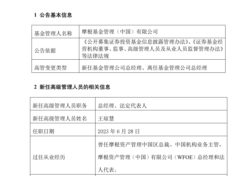 公開資料顯示,王瓊慧于2008年加入摩根資產(chǎn)管理,2009年起擔(dān)任中國(guó)機(jī)構(gòu)業(yè)務(wù)主管,2014年就任中國(guó)區(qū)總裁,2016-2021年間兼任摩根資產(chǎn)管理(中國(guó))有限公司(WFOE)總經(jīng)理和法人代表。王瓊慧擁有超過23年金融行業(yè)經(jīng)驗(yàn),加入摩根大通前曾任職于貝萊德資產(chǎn)管理公司和中國(guó)工商銀行總行。