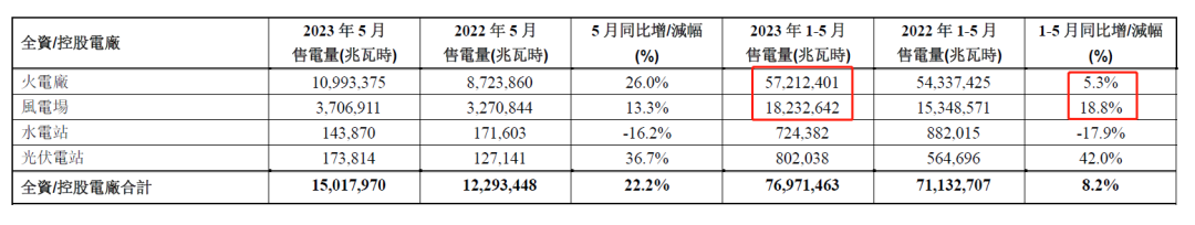 2023年前5月,華潤電力附屬電廠累計售電量為76971463兆瓦時,同比增長8.2%。其中,火電廠累計售電量為57212401兆瓦時,同比增長5.3%;附屬風電場累計售電量為18232642兆瓦時,同比增長18.8%。