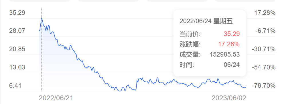 小鵬汽車股價在2022年6月24日達到巔峰,為35.29美元。之后一路下滑,今年5月30日,在小鵬汽車發(fā)布一季度財報一周內(nèi),小鵬汽車股價跌至最低點,7.87美元,較最高點跌去78%。這一切都只發(fā)生在一年時間。