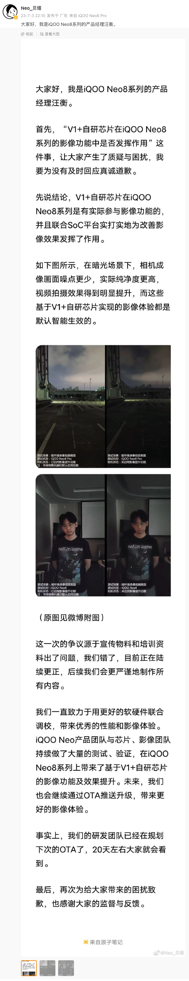 7月3日晚間,iQOO Neo8系列產(chǎn)品經(jīng)理汪衡在微博致歉,表示V1+自研芯片在iQOO Neo8系列有實際參與到影像功能,并聯(lián)合SoC改善影像效果。本次爭議源于宣傳物料和培訓(xùn)資料出了問題,目前正在陸續(xù)更正。研發(fā)團(tuán)隊已在規(guī)劃下一次OTA升級,約20天左右。