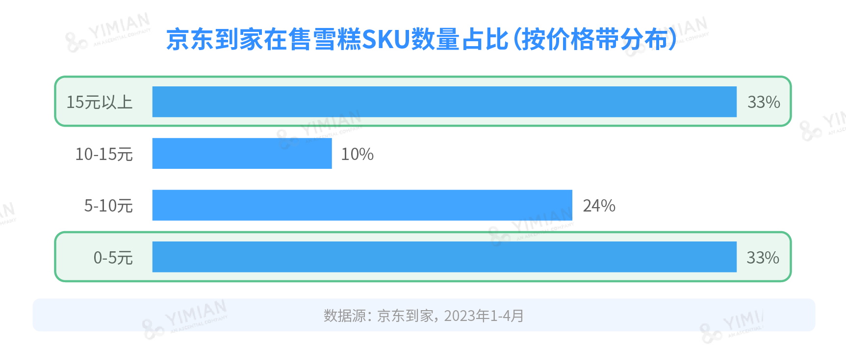 我們先來看今年按價(jià)格帶分布的雪糕SKU數(shù)量,可以看到,目前,0-5元的低價(jià)雪糕與15元以上的超高端雪糕各占比33%,已經(jīng)形成了分庭抗禮的格局。