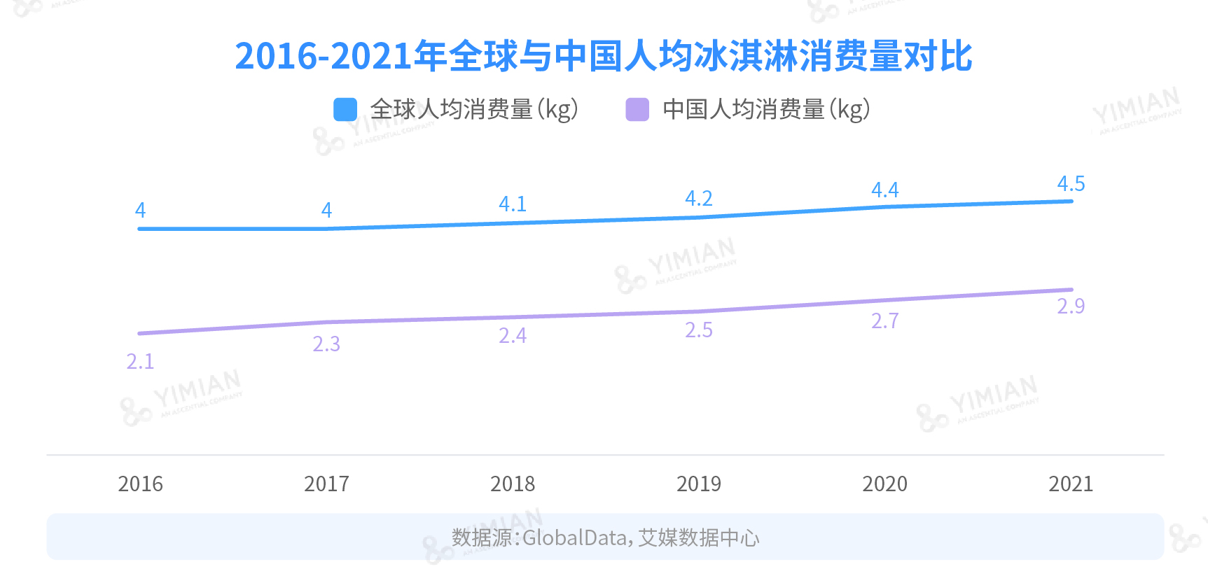 有關(guān)數(shù)據(jù)顯示,2021年中國冰淇淋/雪糕的年人均消費(fèi)量還不到3kg,不及美國年人均的八分之一、日本的四分之一,而全球的平均水平也有4.5kg,與之相比也有很大的差距。