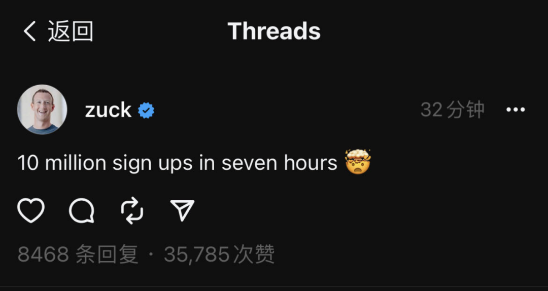 發(fā)布Threads,正面宣戰(zhàn)馬斯克,小扎很激動(dòng),深夜11點(diǎn)還在“直播”Threads戰(zhàn)績。截至發(fā)稿前上線7小時(shí)注冊(cè)用戶數(shù)量達(dá)1000萬,—— 平均每小時(shí)有超過140萬的全球各地用戶涌入Threads。小扎本人目前也斬獲了超過45萬的粉絲。