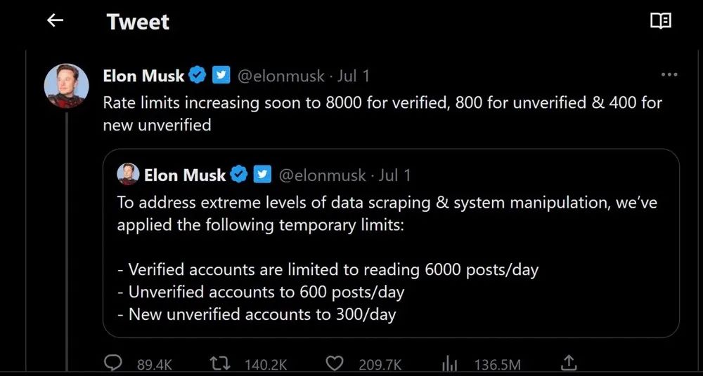 馬斯克表示為了大家的身心健康以及應(yīng)對(duì)數(shù)據(jù)被竊取的問題,已驗(yàn)證的賬戶(付費(fèi)用戶和其他官方認(rèn)證賬戶)每天最多只能閱讀6000篇帖子,未驗(yàn)證的用戶每天最多只能閱讀600篇帖子,新注冊(cè)的未驗(yàn)證用戶每天最多可以閱讀300篇帖子,而未注冊(cè)用戶不允許看任何帖子。