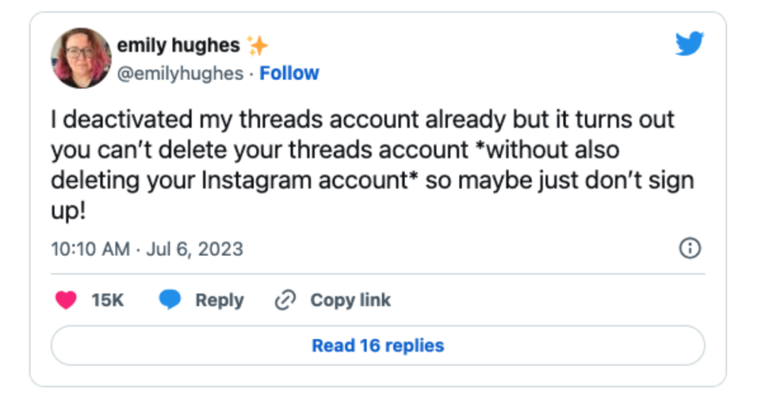 從今天的戰(zhàn)果來看,Threads取得了小小的勝利。但一條關(guān)于Threads的新聞引發(fā)了硅兔君的擔(dān)憂,登陸Threads需要用Instagram的賬戶,這確實(shí)比重新注冊(cè)賬號(hào)更方便,但Threads賬號(hào)無法刪除,除非你先把Instagram賬號(hào)注銷。而這項(xiàng)條款隱藏在Threads補(bǔ)充隱私協(xié)議中,在你注冊(cè)Threads時(shí)不經(jīng)意間就點(diǎn)了同意。