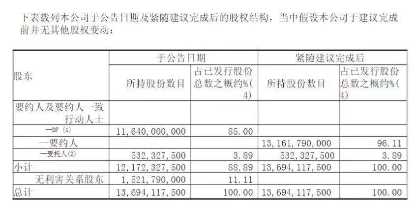 預(yù)計計劃生效后,融世國際將持有已發(fā)行股份約96.11%,永隆信托將持有已發(fā)行股份約3.89%,并將撤回股份在聯(lián)交所的上市地位。