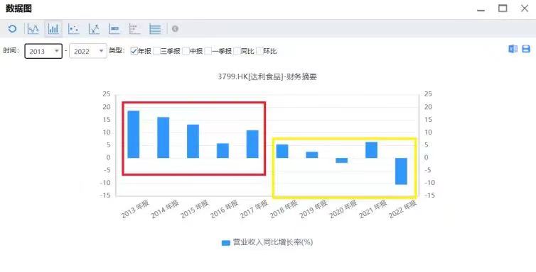 疫情與原材料價格的上漲,或許對營收下降造成一定影響。但達(dá)利食品近5年的營業(yè)收入年均復(fù)合增長率低于上市初期的年均復(fù)合增長率也同時表明,其現(xiàn)在發(fā)展的確有點慢。