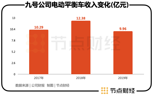 財(cái)報(bào)數(shù)據(jù)顯示,2017年—2019年,九號(hào)公司電動(dòng)平衡車的營(yíng)收分別為10.29億元、12.38億元、9.96億元。做到10億元出頭,規(guī)模就上不去了。