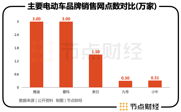 截至2022年年底,雅迪在中國(guó)共有超過(guò)3.2萬(wàn)個(gè)銷售點(diǎn)。愛(ài)瑪?shù)慕K端門店數(shù)量超過(guò)3萬(wàn)個(gè)。新日經(jīng)銷網(wǎng)點(diǎn)約為1.5萬(wàn)個(gè)。九號(hào)公司在全國(guó)的專賣店則不到3000家。