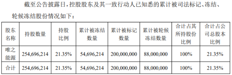 具體來(lái)看,此次唯之能源所持的21.35%上市公司股份分別被廣東省深圳市中級(jí)人民法院、福建省廈門市中級(jí)人民法院司法標(biāo)記、凍結(jié)、輪候凍結(jié),占其所持上市公司股份數(shù)量的100%。