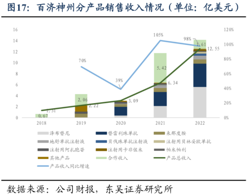 公開數(shù)據(jù)顯示,2022年全年,百濟(jì)神州共實(shí)現(xiàn)營業(yè)收入14.16億美元,抗腫瘤類藥物收入為12.55億美元,同比增長98%。分產(chǎn)品看,百悅澤(澤布替尼)銷售收入為5.647億美元,同比增長159%,收入占比為45%;百澤安(替雷利珠單抗)收入為4.229億美元,同比增長66%,收入占比為34%。