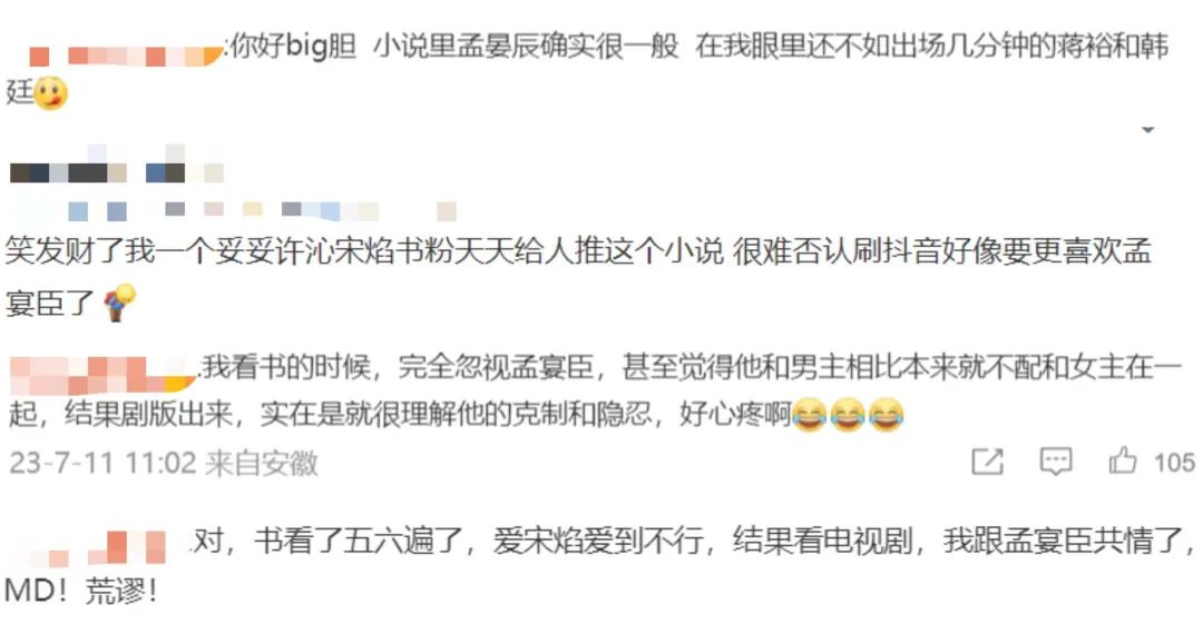 根據(jù)不少書粉的感受來看,原作小說中男主人設很慘,被女主爸媽陷害也沒有遷怒女主,是典型的“虐男主”讓人心疼人設,孟宴臣更像是阻擋男女主在一起的“工具人”,只有寥寥幾筆,劇中的出場也并不多,戲份幾乎都在二次創(chuàng)作的剪輯里了。
