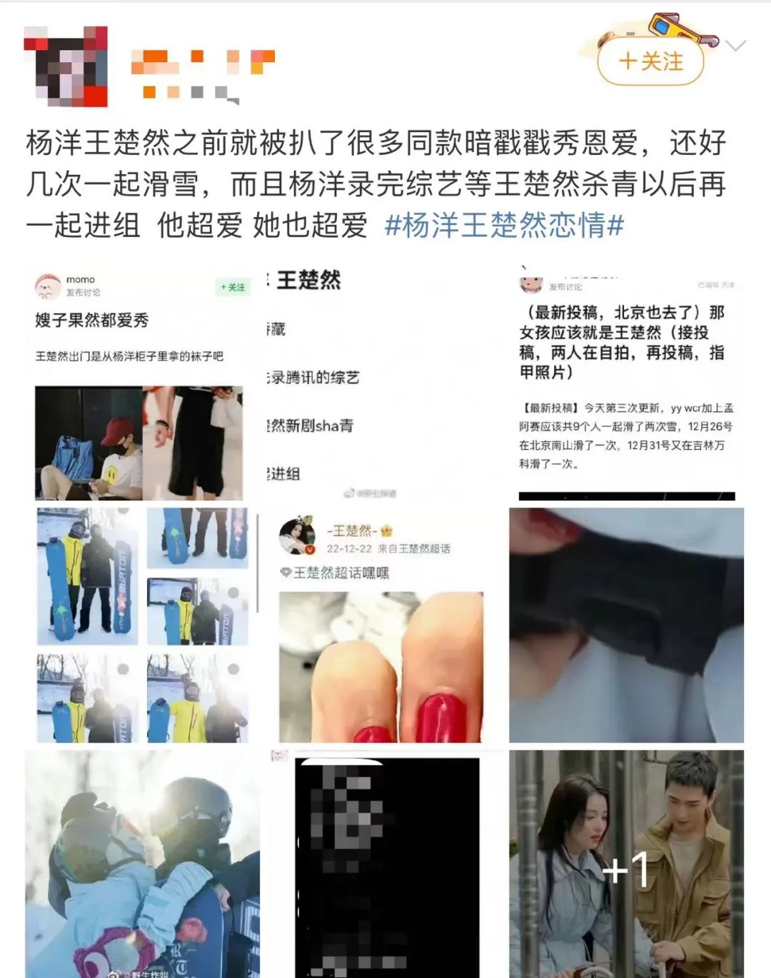 奈何劇還沒播,緋聞先行。今年愚人節(jié),楊洋站姐很有娛樂精神地發(fā)出了六個和楊洋傳過緋聞的女星照片,最后一個就是王楚然,結果被粉絲拉黑舉報,站姐又發(fā)出了一組雙人滑雪圖片,也被認為是楊洋與王楚然一同滑雪的照片。5月中旬,狗仔放出視頻爆料,又為這段緋聞增添了一份“證據(jù)”。