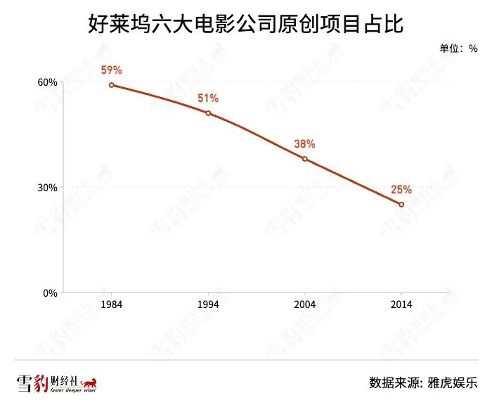 2014年,雅虎娛樂整理了1984、1994、2004和2014年好萊塢六大制片公司的原創(chuàng)片比例,從59%一路下跌至25%。在今天的好萊塢六大電影公司的片單中,原創(chuàng)項(xiàng)目更是屈指可數(shù),且多集中于動(dòng)畫領(lǐng)域,IP系列占據(jù)了絕對(duì)的主流。