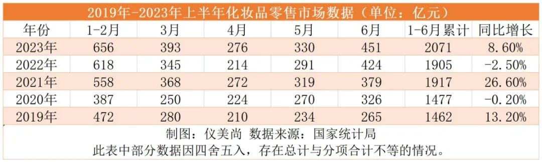 不過,從單月數(shù)據(jù)來看,2023年1-2月、3月、4月、5月和6月,均創(chuàng)下近5年新高,同比增長分別達(dá)到38%、14%、29%、13和6%。若按累計數(shù)據(jù)看,今年3月-6月,化妝品類零售則分別同比增長9.6%、24.3%、11.7%。
