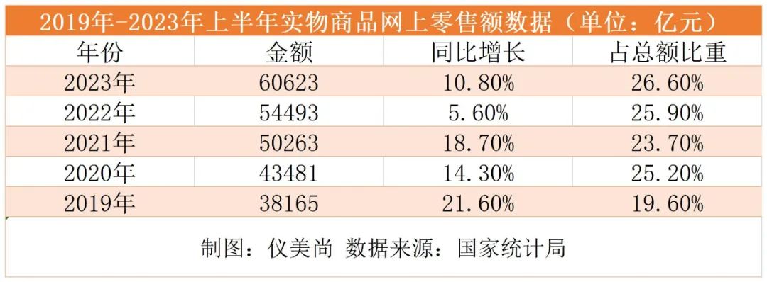 儀美尚統(tǒng)計了2019年-2023年上半年的實(shí)物商品網(wǎng)上零售額發(fā)現(xiàn),近5年上半年,網(wǎng)上零售占社會消費(fèi)品零售總額的比重逐年上升,從19.6%躍升至26.6%。