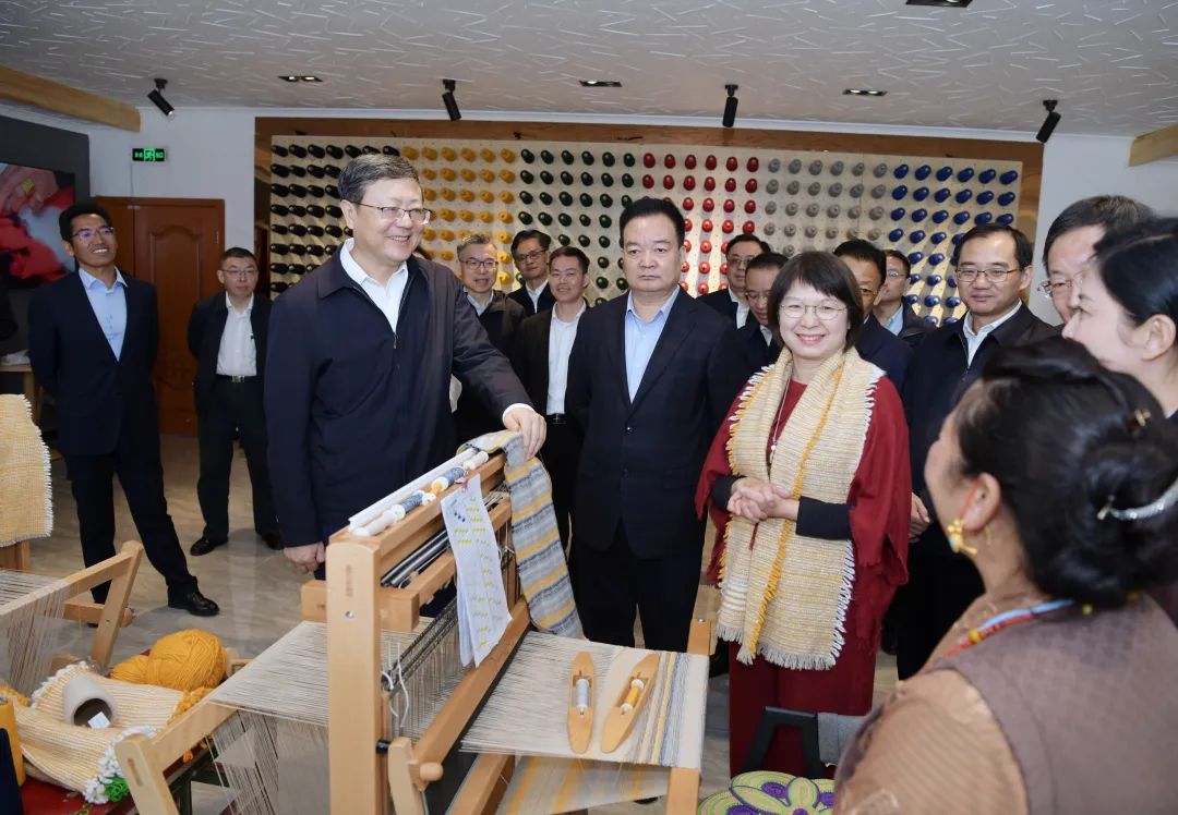 沿著年楚河谷,陳吉寧一行來到江孜縣年堆鄉(xiāng)索蓋村。一條新修的硬化路連接起索蓋村105戶人家,萬畝青稞拔節(jié)抽穗,大片油菜花盛開,一幅美麗鄉(xiāng)村畫卷徐徐展開。代表團(tuán)一行沿途察看村貌,聽取村史和鄉(xiāng)村振興示范村建設(shè)情況介紹。村干部告訴滬藏兩地領(lǐng)導(dǎo),在上海援助下,村里堅(jiān)持黨建引領(lǐng)、產(chǎn)業(yè)支撐、民生賦能,開展人居環(huán)境整治,引入了合作企業(yè),村民人均收入和村集體經(jīng)濟(jì)收入持續(xù)增長。在上海工匠氆氌工作室,三名藏族婦女正在學(xué)習(xí)編織更具創(chuàng)意設(shè)計(jì)的氆氌。陳吉寧詳細(xì)了解當(dāng)?shù)靥厣a(chǎn)品研發(fā)和手工業(yè)合作社運(yùn)作情況。他說,改善民生、凝聚人心,是我們做好對(duì)口支援工作的出發(fā)點(diǎn)和落腳點(diǎn)。要圍繞鞏固拓展脫貧攻堅(jiān)成果和鄉(xiāng)村振興有效銜接,立足當(dāng)?shù)刭Y源和傳統(tǒng)文化,圍繞特色產(chǎn)業(yè)建立標(biāo)準(zhǔn)、提升品質(zhì)、做強(qiáng)品牌,實(shí)現(xiàn)可持續(xù)發(fā)展。要加大民生投入,著力改善基層生活設(shè)施、提高公共服務(wù)水平,全面提升農(nóng)牧民的獲得感、幸福感、安全感。