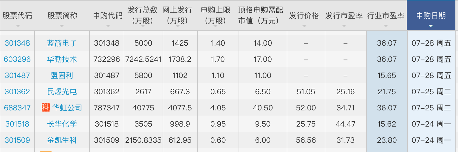7月28日周五還有3家公司可供申購者選擇,分別是盟固利(301487.SZ)、華勤技術(shù)(603296.SH)、藍箭電子(301348.SZ)。資料顯示,盟固利主營鋰電池正極材料的研發(fā)、生產(chǎn)和銷售;華勤技術(shù)搞智能硬件產(chǎn)品的研發(fā)設(shè)計、生產(chǎn)制造和運營服務(wù);藍箭電子主營半導(dǎo)體封裝測試業(yè)務(wù)。