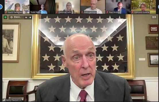 美國前財政部長亨利·保爾森與中國國際經(jīng)濟交流中心副理事長王一鳴舉行了對話。