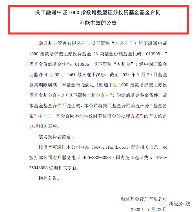 2023年7月22日,融通基金發(fā)布關于融通中證1000指數(shù)增強型證券投資基金基金合同不能生效的公告稱,公司旗下融通中證1000指數(shù)增強型證券投資基金(A類基金份額基金代碼:013905,C類基金份額基金代碼:013906,以下簡稱“本基金”)經中國證監(jiān)會證監(jiān)許可〔2022〕2561號文準予注冊。截至2023年7月20日基金募集期限屆滿,本基金未能滿足基金合同約定的基金備案條件,故本基金基金合同不能生效。